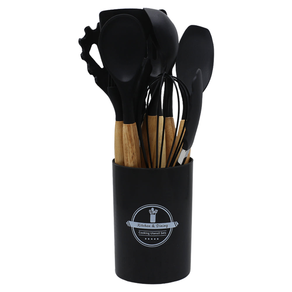 12-Piece Silicone Cooking Utensil Set With Wooden Handle And Holder (Black).