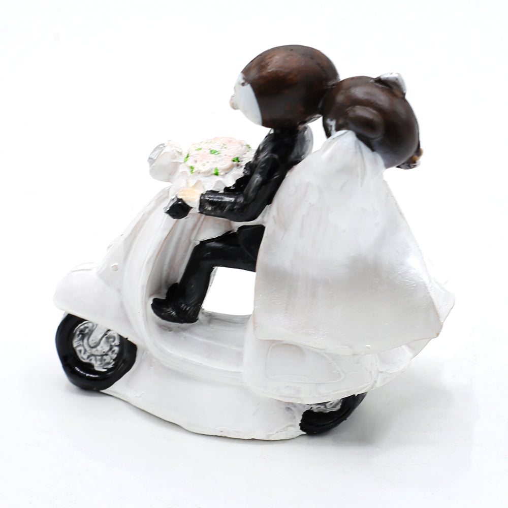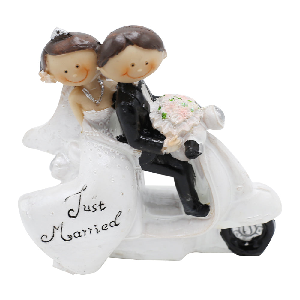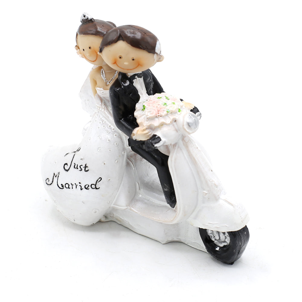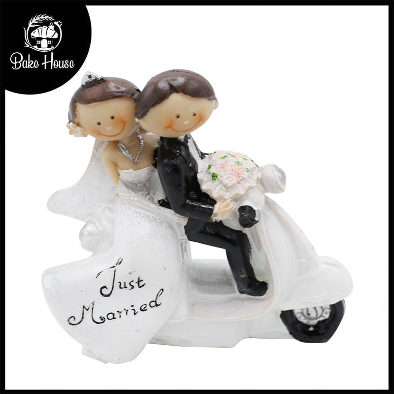Just Married Bride and Groom on Scooter Cake Topper is a delightful decoration featuring a newlywed couple riding a scooter. Perfect for wedding or engagement cakes, it adds a playful and romantic vibe to your celebration. Made from durable material and easy to place on cakes.