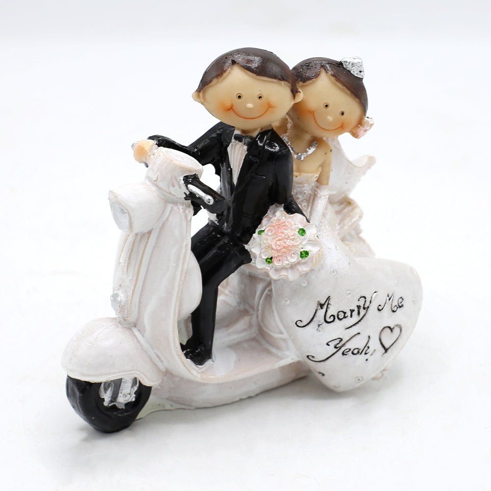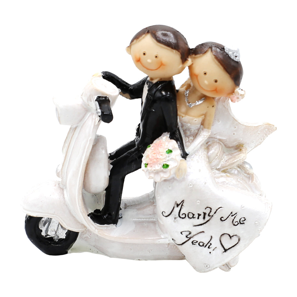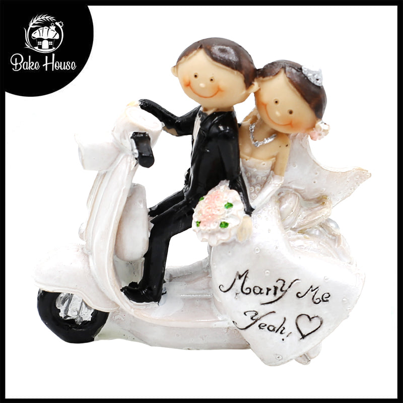 This fun and unique cake topper features a bride and groom riding a scooter with the words “Marry Me Yeah”, adding a playful touch to wedding or engagement cakes. With its charming design, it symbolizes joy and togetherness, making the celebration more memorable and picture-perfect.